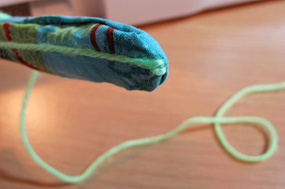 Now here is something I've hated to do - turn something inside out without anything to make it easier. I thought of a brilliant idea - use a wool string and have it as a means of pulling the inside out. So for this part, if you're adventurous enough like me, you'd need a reasonable length of a wool string (I've had this old green acrylic wool string measured around 40cm long) and a wood stick.
